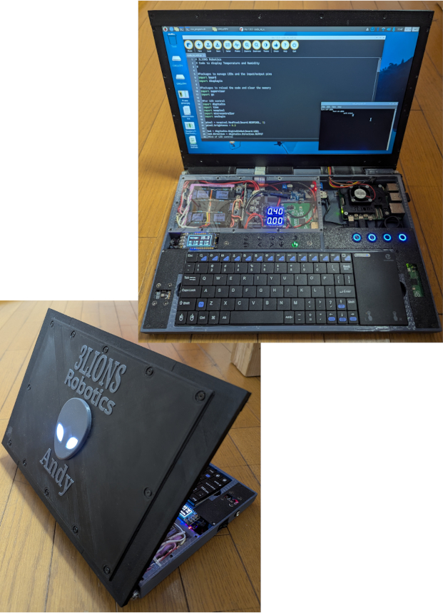 生徒さんには、Raspberry Pi 5を内蔵した3Lionsロボティクス・ノートパソコンをお渡ししますが、 これも一つのプロジェクトで、生徒さんはLEDとプログラム可能なボタンをカスタマイズする方法を学びます。 生徒さんがバッテリーの仕組みや危険性、安全に保つためのエレクトロニクスを理解するまで、 ノートパソコンにバッテリーは含まれません。